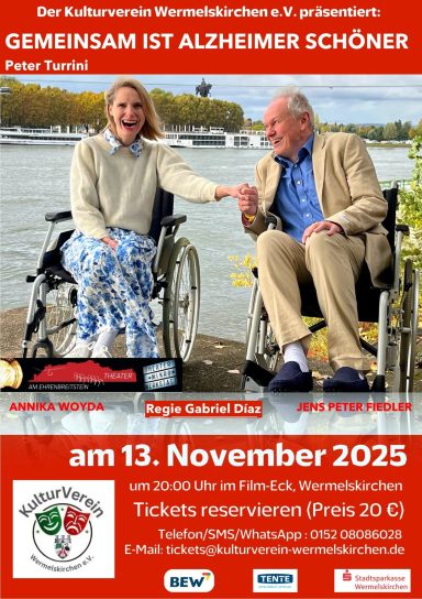 - 13. November 2025 – Gemeinsam ist Alzheimer schöner: Das Theater am Ehrenbreitstein präsentiert Peter Turrinis berührendes Kammerspiel über Alzheimer, Zeit und die Kraft kindlicher Neugier. Ein Kind stellt Fragen, wo Worte fehlen – und bringt Leben in die Stille. Zwischen Lautsprechern und Erinnerung entfaltet sich ein zarter Dialog über Vergessen und Zukunft.